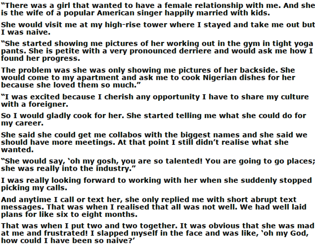 In an exclusive interview with Daily Sun, Naija pop artiste Abiodun Koya revealed how her refusal to date a Lesbian in the United States costs her mouth-watering record deals.