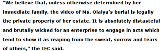 In a statement signed by the administrator of IFC, the family of the deceased noted that Bayowa films produced the movie without authorization and made it into VCDs in a manner that suggested it was for sale.