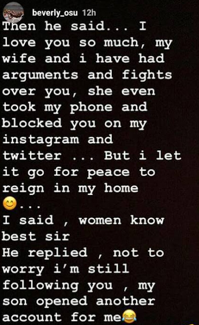 The entertainer with a body most men lust after recently shared on Instagram how a married elderly man she met in a bank confessed to her that he frequently fights his wife because of his love for Beverly.