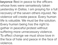 July 10, 2016 – Beyonce Condemns Lone Reprisal Attack The Killed 5 Policemen In Dallas Texas