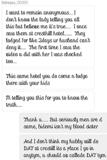 The troll who identifies herself as Bidemi’s friend told Bose her husband allegedly rented an apartment for Bidemi to facilitate their bedroom meeting.