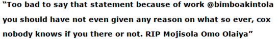 Her fans later came hard on her, saying her reason for missing Moji Olaiya’s burial was totally unacceptable.
