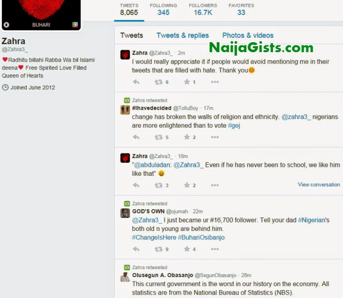 Jan 27, 2015 – Buhari’s Daughter Zahra Closed Down Twitter Account Over Threat To Life After Attacking PDP For Raising Questions On Dad’s Certificate