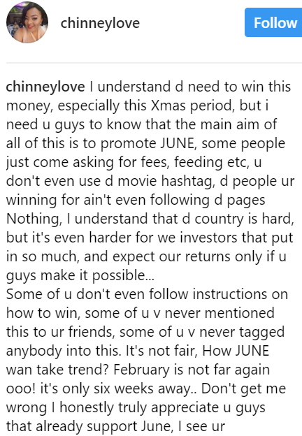To further promote the movie titled ‘June’, the actress has been giving away freebies via her official Instagram page with a condition that winners will be tasked with the responsibility of promoting her new movie. Sadly, most of them disappears after collecting her reebies.