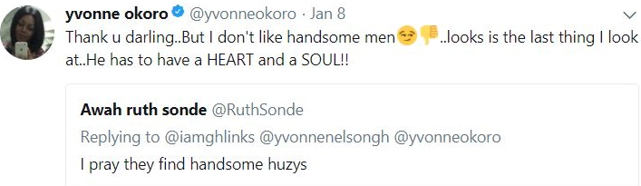 In her reply to a fan who prayed for her and Yvonne Nelson to find handsome men to marry, the actress said those who believe she falls for guys because of their look should let go of such erroneous mindset about her.
