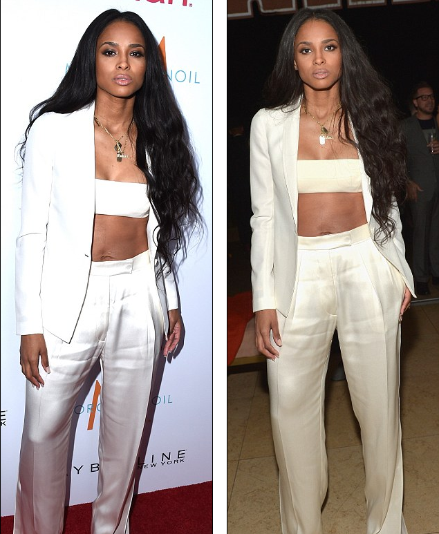 7 months after baby delivery, singer Ciara has made her first official outing. Last night, the beautiful first time mother stormed Los Angeles Fashion Awards night event that held at the Sunset Tower Hotel in a cream satin suit with matching bandeau bra revealing her flat post-baby belly.