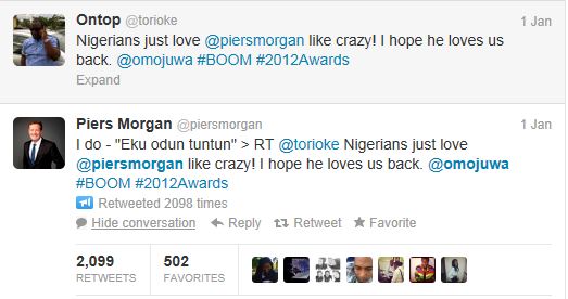 On the 1st of January, 2013, New Year’s day, CNN host Piers Morgan was reported to have expressed his love for Nigerians in Yoruba language in a reply to a tweet shared by a Naija man with Twitter handle OnTop. naijagists.com