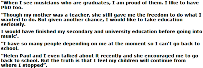 In a recent chat with The Point, the veteran musician said dropping out of secondary school was one of his biggest regrets in life. He added that when he sees educated musicians, he’s always very proud of them.