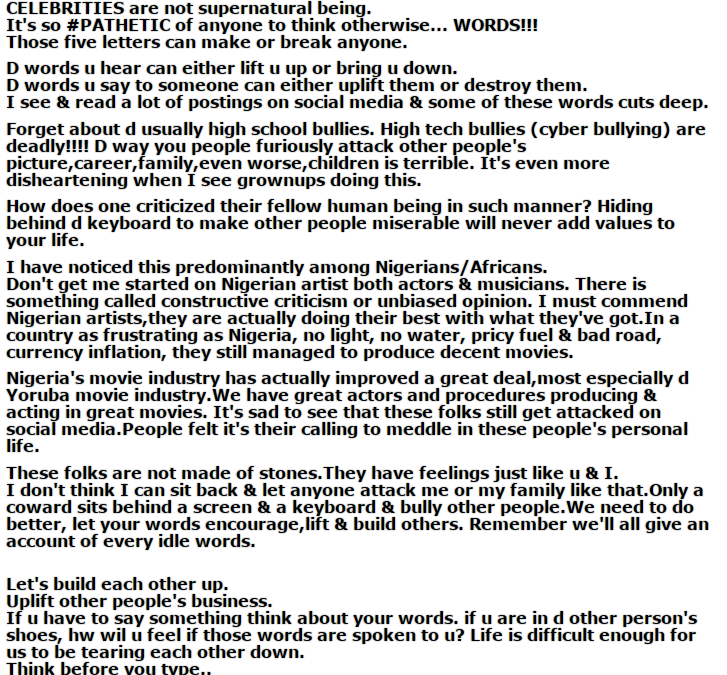 Hours after Kemi Olunloyo was picked up from her house in Ibadan, one of her victims, Dayo Amusa has come after cyber bullies who bully celebrities.