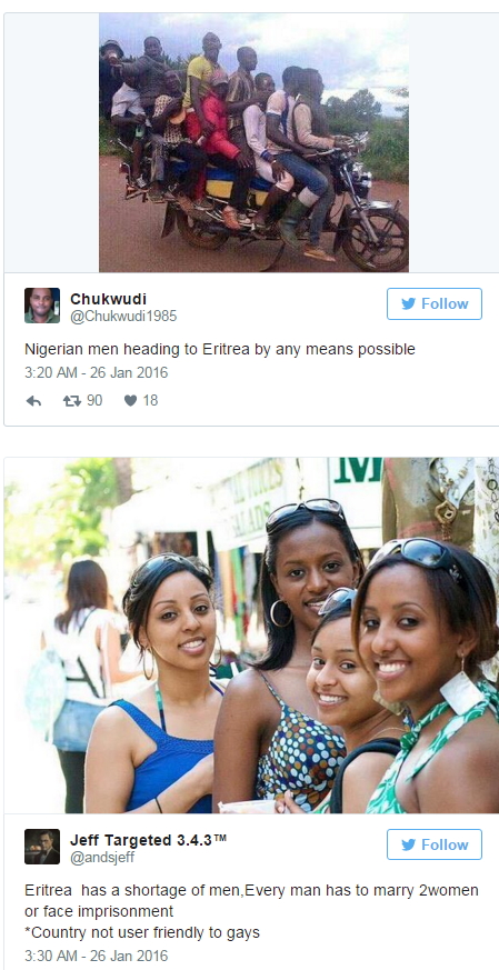 January 26, 2016 – Shortage Of Men, Husbands: Nigerians Go Gaga As Eritrean Government Orders Men To Marry Two Wives