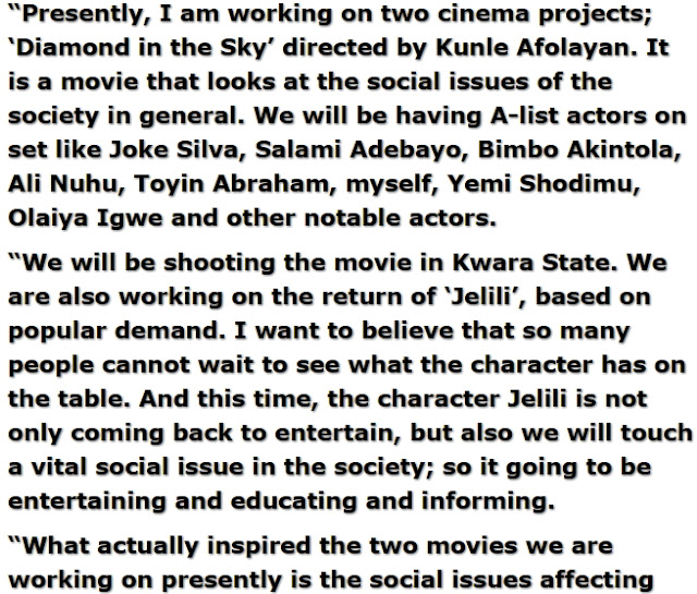 The movies titled Diamond in the sky and the Return of Jelili will be directed by ace filmmaker Kunle Afolayan.