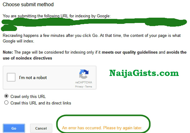 Fix For Fetch As Google Webmaster Tool “An Error Has Occurred. Please Try Again Later”