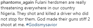 The social media user @Phantomx_again told his friends and fans that the hersdmen attacked him with rifles but he managed to escape when he reversed his car on high speed.