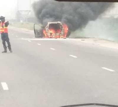 In Pictures: Driver Escapes Death As Car Catches Fire On Lekki Epe Expressway In Lagos