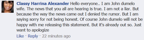 “Hello everyone.. I am John dumelo wife. The news that you all are hearing is true. I am not a liar. But because the way the news came out I denied the rumor. But I am saying sorry for not being honest. Of course John dumelo will not be happy with me releasing this statement. But it’s already out so. Just want to apologize”