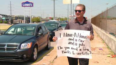 From a distance, Eaton looked a bit like any other panhandler holding a sign at a street corner. But instead of a plea for money, his sign read: “I have a home… and a car… and a job. Do you need a few bucks for some coffee?”