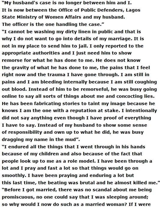 The mother of two who said she is still going through a lot of pain confessed that she is now bleeding internally due to the trauma she went through the day her husband attacked her while acting like he was under the control of some demons.