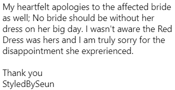 The greedy tailor, founder of Rikaoto By Me, Maryam Elisha who sold the dresses to Olopade didn’t inform him the controversial red dress belonged to her client.