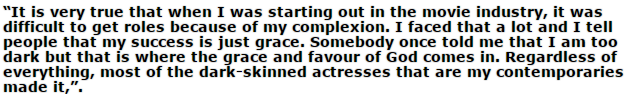 The versatile actress who has become a household name today revealed that she faced rejection at some point in her acting career when some movie producers allegedly refused to give her slot in their production because she is dark in complexion.