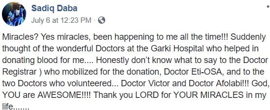 Miracles? Yes miracles, been happening to me all the time!!! Suddenly thought of the wonderful Doctors at the Garki Hospital who helped in donating blood for me…. Honestly don’t know what to say to the Doctor ( Registrar ) who mobilized for the donation, Doctor Eti-OSA, and to the two Doctors who volunteered… Doctor Victor and Doctor Afolabi!!! God, YOU are AWESOME!!!! Thank you LORD for YOUR MIRACLES in my life…….