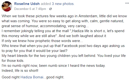 The last thing she wrote on Facebook is the death of a close friend, Hadiza Bomai who died early this week and left two young children behind.