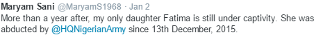 The Twitter user, Maryam Sani said her only child, Fatima is yet to be freed since she was abducted during the 2015 Zaria massacre (December 13 2015).