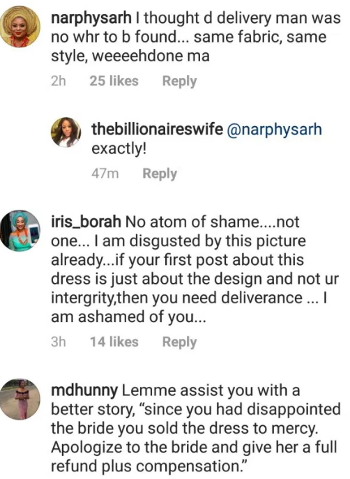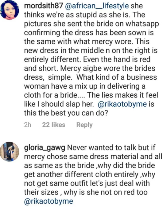 January 4, 2018 – Lagos Tailor Maryam Elisha Sends Client Used Wedding Dress After Selling Her Original Dress To Mercy Aigbe