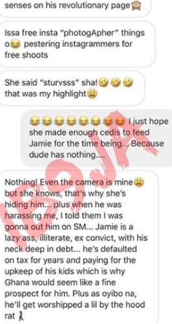 In the leaked Instagram chat, Keela alleged that Jamie’s relocation to Ghana is to get himself back together and used Africans who see Whites as Demi gods to make money.