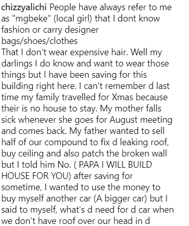 However when the need arose, Chizzy who is not as popular as most of her colleagues used the influence of her wealthy boyfriend(s) to raise her parents from the dust.