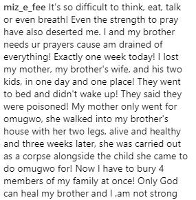 Ify Arinze said her mom, sister in law (Amara), her nephew (2 months old) and niece slept and didn’t wake up in the morning.