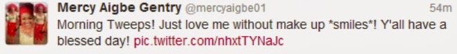 “Morning Tweeps! just love me without makeup *smile*! Y’all have a blessed day!”