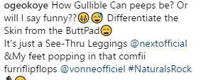 A lady wearing butt pad can’t wear see through legging. Oge Okoye is naturally endowed.