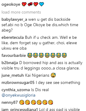 In one of the photos she recently uploaded on her official IG page @ogeokoye, most of her fans called her out for displaying unusually big backside, most even alleged she’s wearing butt pad.