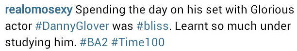 “Lol… See who I ran into in my hotel. The beautiful Mel B. We have a common friend designer, Bunmi Koko. Lol…She is so funny and that accent! She joked much about my #butt. She is now a judge on Americas got talent.
