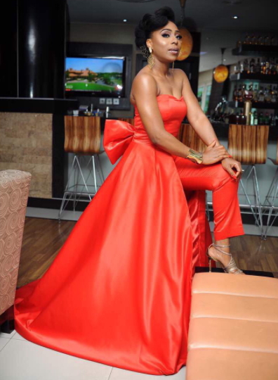 The mother of two was spotted at the Nigerian Premiere of Isoken movie looking stunning in a candy red trail cape jumpsuit.