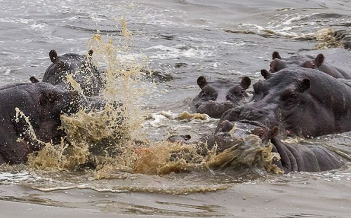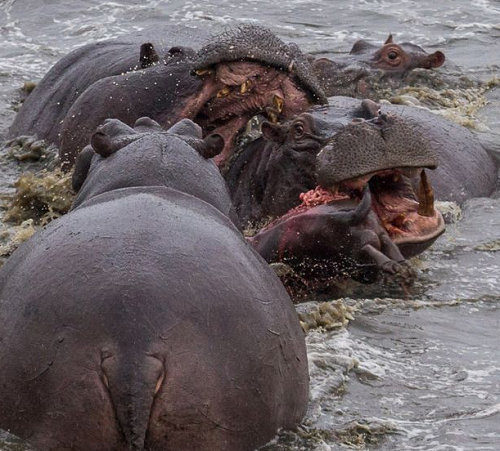 The hippos continued to attack the calf for about 2 minutes as her mother continued to defend herself.