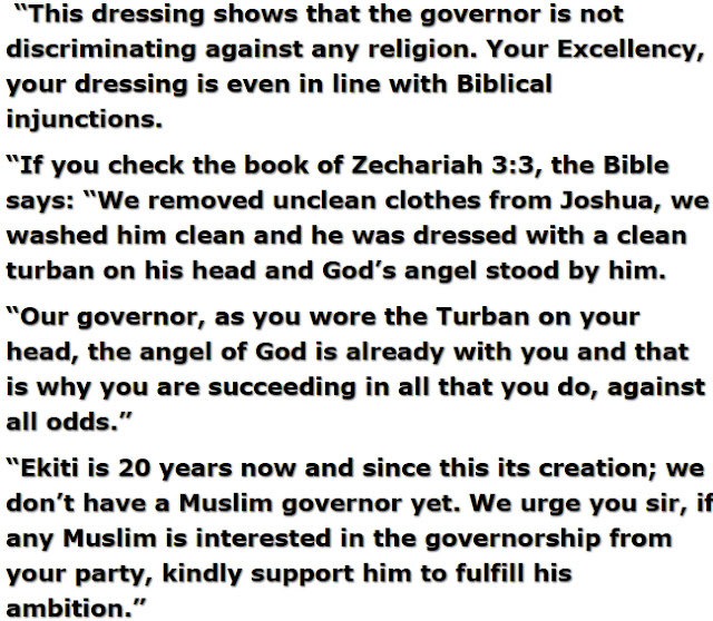 One of the Imams who officiated the event praised Fayose for wearing a turban and urged him to ensure a Muslim becomes the next governor of Ekiti state.