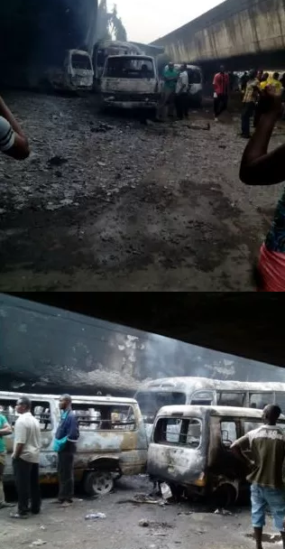 December 5, 2015 – Pictures: Fuel Tanker Falls Off Bridge In Ojuelegba Lagos, Fire Explosion Destroys Houses & Cars