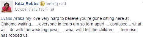 Her husband who worked as a Credit Manager for an Islamic Organization in Mandera was among the Christians butchered by the Al Shabaab terror sect last week (October 6 2016 precisely).