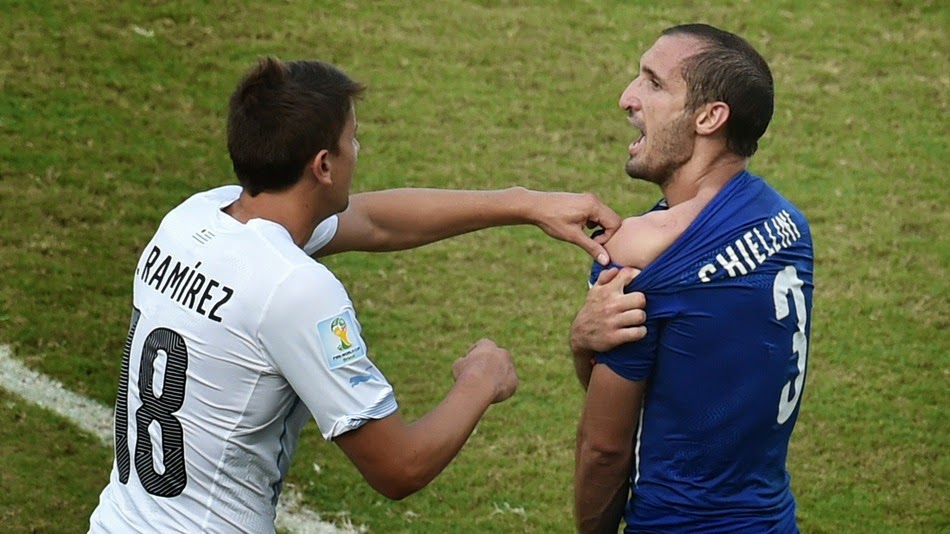 Suarez bite Italy defender, Giorgio Chiellini ‘s shoulder and immediately after the clash, Chiellini pulled his shirt down to protest the bite, showing the referee the alleged bite mark on his shoulder but no action was taken by the official. Instead, Suarez, 27, went to ground holding his mouth, apparently suggesting he had been elbowed.