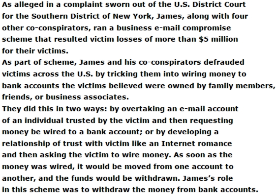 In an announcement by the New York Office of the Federal Bureau of Investigation, James allegedly duped many residents of Brooklyn to the tune of $5million.