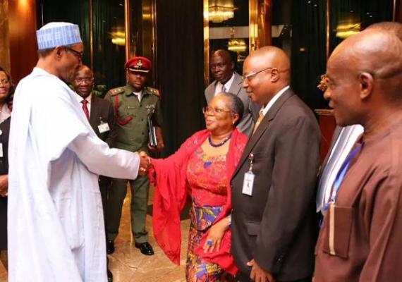 She is the first official from Jonathan’s administration to go down on her kneel to greet Buhari.