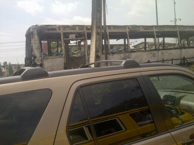 July 4, 2014 – Pictures: Nigerian Soldier Crushed To Death By LAG Bus On BRT Lane In Ikorodu Lagos, Colleagues Set Buses On Fire