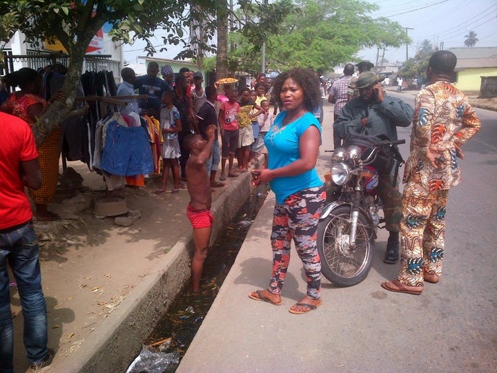 The guy pictured above in red boxer escaped death by a whisker this afternoon after he was caught in a spiritual theft mess in Calabar Cross River State.