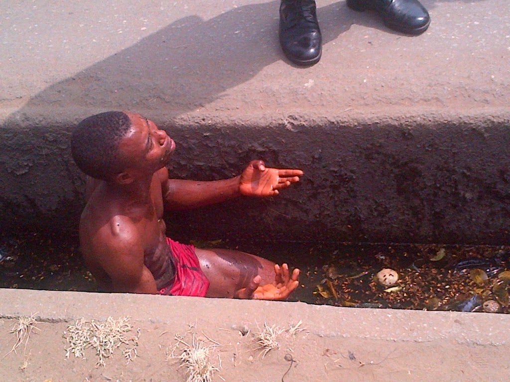 He took to his heels but the soldiers caught up with him and forced him to swim in that gutter pool.