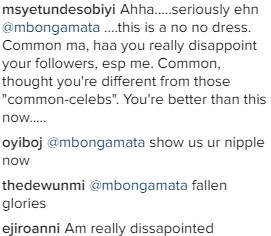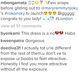 Her ‘partner in crime’, Mbong Amata also came under fire for allegedly revealing too much cleavage in a sexy yellow outfit she rocked to the Red Carpet at Rok Sky Channel Launch in London on Friday.