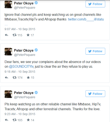 Worried fans took to the social media to ask Peter Okoye who later warned them to stop watching Sound City and instead watch other reliable music stations like MTV, Hip,etc.