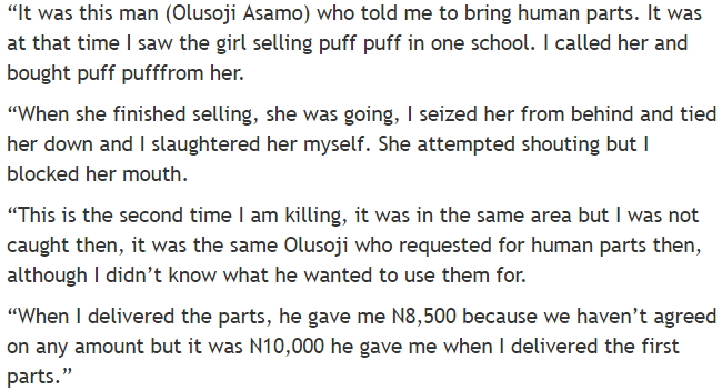 Nov 13, 2017 – Ritualist Who Murdered Puff Puff Seller In Ogun State Confesses ” I Sold Her Parts To Herbalists For N8500″