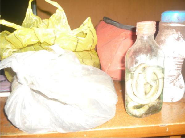 According to Yusuf Ayila in a recent interview, he alleged that he caught his Fetish wife with black charms and voodoo that comprises of a snake in a bottle of gin and many other strange things.