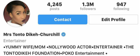 As at the time of this report, Tonto Dikeh has changed her Instagram name from Mrs Tonto Dikeh Churchill to Tonto C. Dikeh.